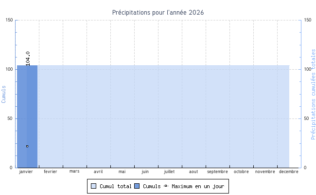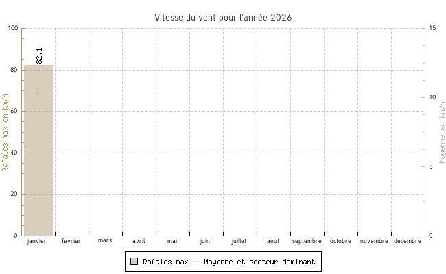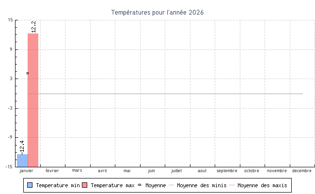 | janvier | -12.4 °C | 1.1 °C | 12.2 °C | 6.9 °C | 4.1 °C | 11.2 km/h | 82.1 km/h | S |